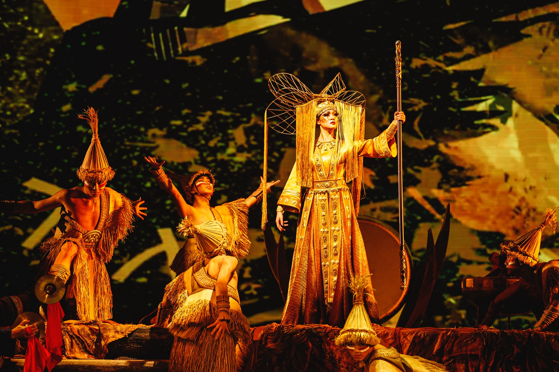 強(qiáng)勁的節(jié)奏在祠堂上空響起,赤裸上身、身著原始草裙的村民肅立成陣,跳起了土苗民族的茅古斯舞;舞臺(tái)中心的升降臺(tái)載著裝扮華麗神秘的女祭司慢慢升起,作為這場儀式的指揮,她的吟唱仿佛統(tǒng)領(lǐng)著整個(gè)森林山谷中的所有神力......